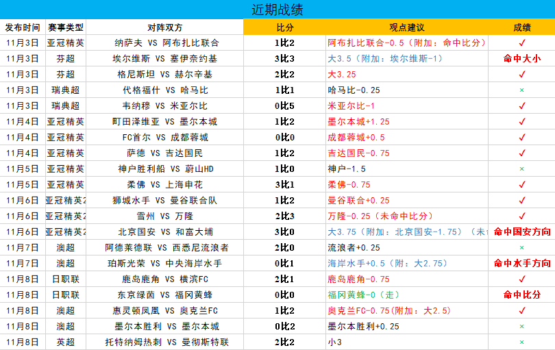 今日继续是不知的日职联开开胃,昨日战绩:5场2胜1走(命中比分),整体战绩19中13,日职联近5场的命中率也有80,以下是统计的本周战绩表!