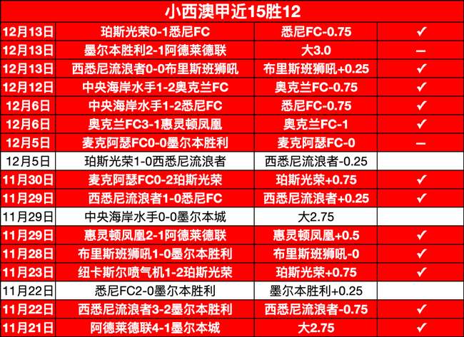 战绩回顾:今日澳甲全面开战!昨日的澳甲全胜,目前澳甲15胜12,胜率达到了80%!近18场更是达到了78%的胜率!