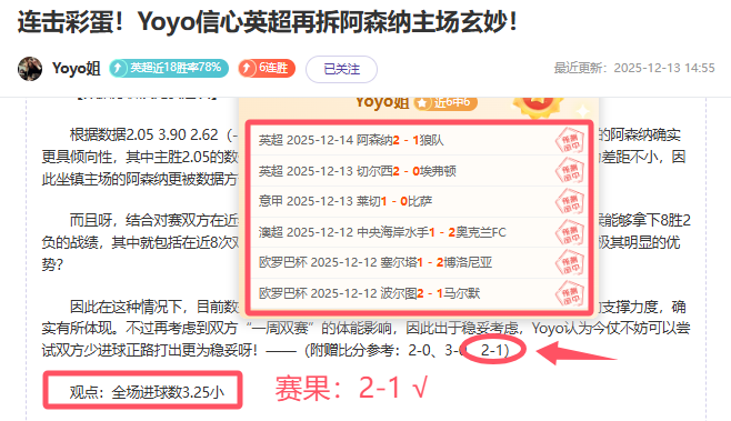 【上期回顾】:昨天私推失利很可惜,不过公推英超切尔西再次成功拿下,近13胜11表现不错!另外超级重点英超方案阿森纳2-1直接彩蛋击出,三连胜棒棒哒!——今天核心赛事已确认,信心依旧,各位可点击一下【赞赏】按钮给予鼓励,轻松在“站内信”获取当天新鲜信心专场哦!多一份参考离喜悦再近一步,Yoyo将继续率粉粉们继续前行~