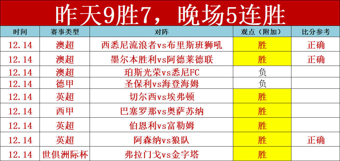 1、昨天状态十分炸裂,整体拿下9胜7的佳绩,晚场更是炸裂,拿下5连胜,王牌澳超不负众望,两天拿下4胜3,另外私推也炸裂,拿下3胜2,今天乘胜追击,冲6连胜。