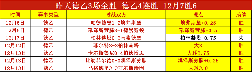 昨天5胜4,德乙3场全胜,德乙拿下4连胜,12月德乙7胜6!今天赛事依旧选择强项系列,持续稳,别错过了!笔者近期前进脚步表现仍然优秀,本日赛程继续出击,争取在稳健的基础上进一步突破!