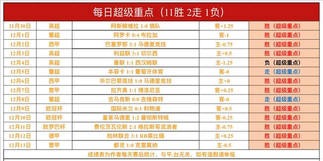 战绩回顾:昨日【每日超级重点】意甲都灵方向完美高位全胜,【每日超级重点】12胜11,成绩非常出色!解锁文章4战拿到3胜1负,成绩出色!意甲都灵、德甲法兰克福、法甲图卢兹完美胜利,意甲亚特兰大没有打出!鸡锅不追求场次多,追求少而精准,绝不滥竽充数,必须把老铁们的每一份信任都转化为胜利!