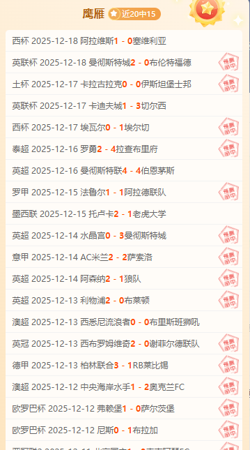 成绩回顾:昨日3胜2,近期成绩20胜15,状态十分稳定。感谢一直以来的支持与陪伴,今天看好不错的赛事,强项赛事很有信心,鹰雁也曾创下19连胜的超高记录。愿大家在观赛的同时,也能收获满满的喜悦与惊喜,觉得还行的不妨继续关注,一起开启精彩的足球之旅。