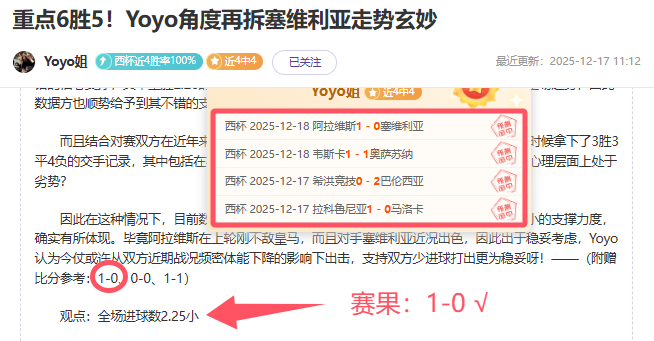 【上期回顾】:昨天私推暂停,而公推西杯再取胜利,近17胜13表现不错!另外超级重点西杯方案再次拿下彩蛋,近7胜6依然棒棒哒!——今天核心赛事已确认,信心依旧,各位可点击一下【赞赏】按钮给予鼓励,轻松在“站内信”获取当天新鲜信心专场哦!多一份参考离喜悦再近一步,Yoyo将继续率粉粉们继续前行~