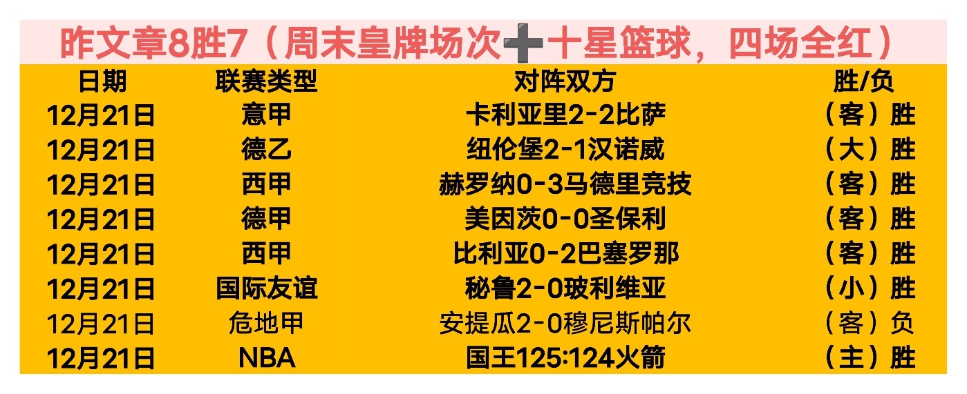 【昨日回顾】昨日精选文章拿到8胜7的佳绩,而且(皇牌场次+十星篮球)周末四场全胜!还记得上周末的四场全胜!近两周 周末八场招牌全部拿下!含金量甚高!新的一周再出发,用心分享每一场,欢迎关注!