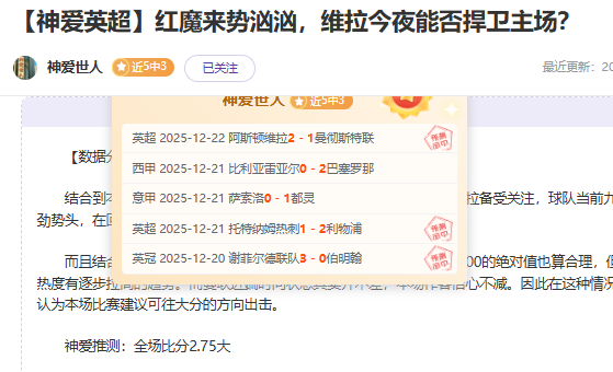 【作者前言:一名深耕足球篮球赛事领域的文字创作者,独创“数据+战术+心理”三维分析法,为粉丝提供独家前瞻内容。昨天重点中的英超维拉vs曼联大分成功打出,希望各位继续关注,福利多多!】