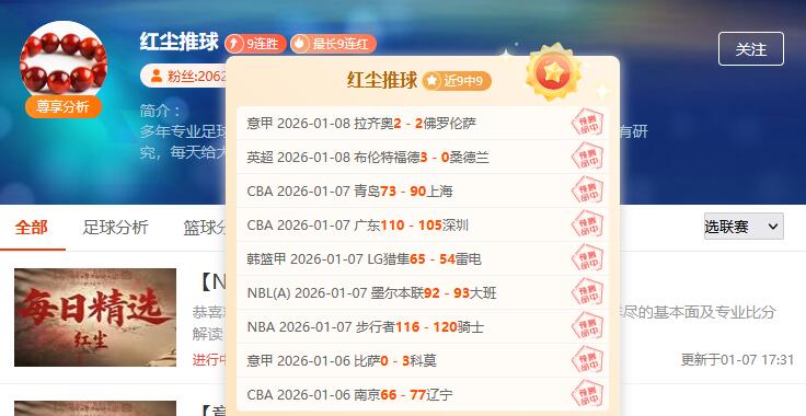 而最近两日状态最火的作者无疑是【红尘推球】,这位作者近期拿到了九连红的高光战绩,足球篮球分析全面开花,正在踌躇不知道追随那位高手的小伙伴不妨可以看看↓↓↓↓