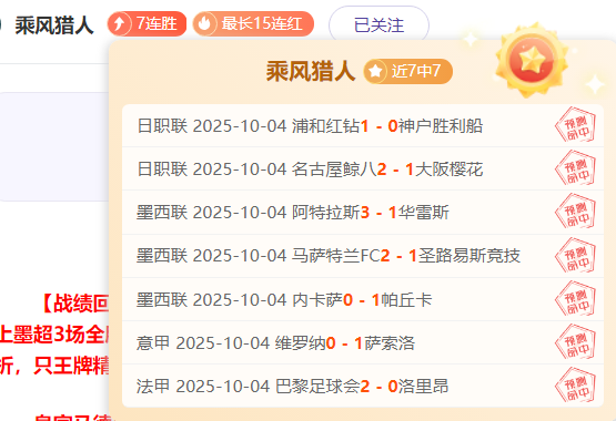 【战绩回顾】墨超冲5连胜!早场日职再红,豪取7连胜!昨日精选7场全不败,法甲打出比分2-0,意甲打出1球进球少拿下,早上墨超3场全胜,日职1胜1平!周末火热来袭,比赛非常丰富,赛事质量佳!乘胜追击,信心强烈,全力分析,只王牌精研有把握的比赛,继续拿下,加油冲全胜!欢迎长期关注猎人。