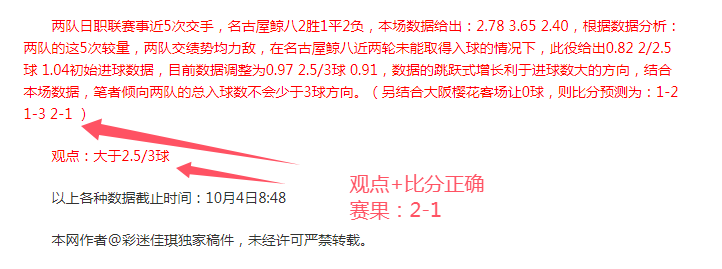 昨日公推日职联赛事,名古屋鲸八主场2-1力克大阪樱花,观点+比分方向完美打出。