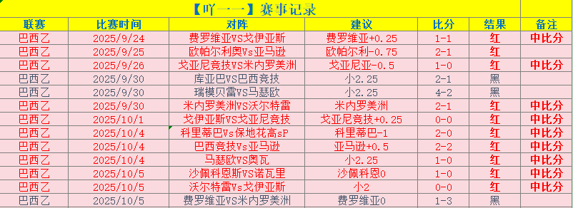 【回顾】巴西乙近期整体状态不错,15场命中12场,近8红7,保持80%的命中率!比分命中率也是相当高,近10场命中的赛事有9场中比分。