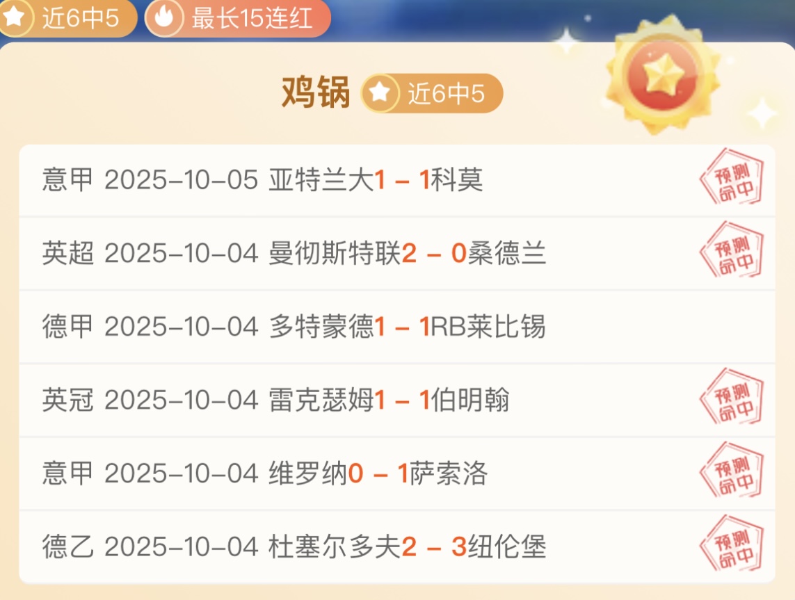 战绩回顾:昨日总计6战拿到3胜2走1负,成绩出色!解锁文章4战拿到2胜1走1负,解锁文章近11胜8,成绩出色!英超曼联、意甲科莫胜利!英超西汉姆联走了!德甲多特没有打出!总进球数1场,英冠德比郡大方向走了,总进球数依然近6胜5,成绩出色!赞赏数据1场胜利,赞赏数据近18胜13,成绩出色!鸡锅不追求场次多,追求少而精准,绝不滥竽充数,必须把老铁们的每一份信任都转化为胜利!