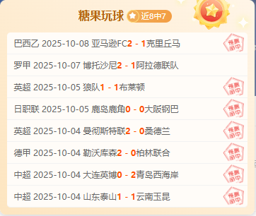 「糖果玩球」8中7:主流联赛分析专家,专注于英超、日职联、中超等热门赛事,以稳健风格著称。近期8场预测命中7场,命中率稳定,是跟随主流赛事的不二之选。