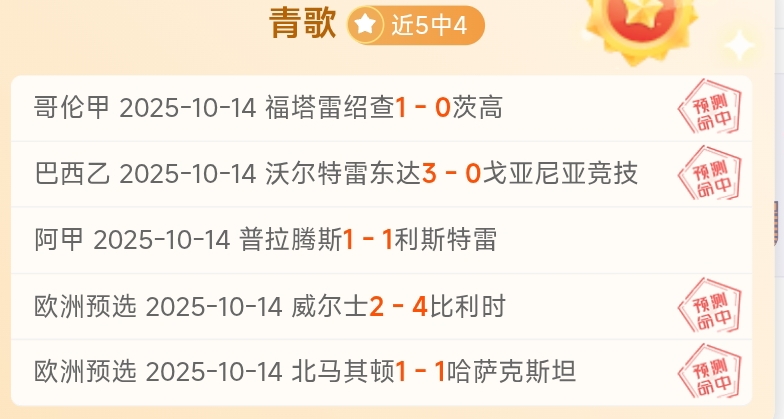 青歌简报:昨日8中5再次平安落地,连盈五天!超长线35中25的稳定发挥离不开老哥们的大力支持,今日赛事依旧研究到位,有信心持续扩大高光表现!