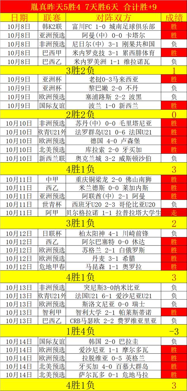 昨天5胜4,近7天胜6天,合计胜+9,取得可观的胜+表现。