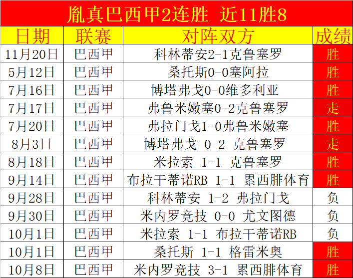 巴西甲2连胜,近11胜8,美洲赛事是强项。昨天5胜4,近7天胜6天,合计胜+9,取得可观的胜+表现。
