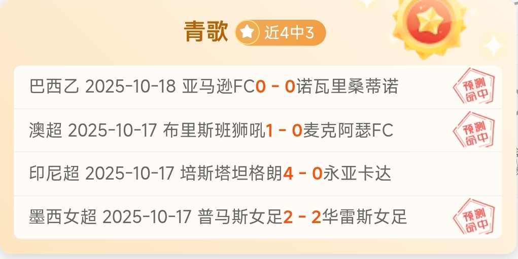 青歌简报:昨日表现不俗。澳超一胜一平,拿手巴西乙顺利打出,高歌猛进的势头开启周末征程!再次感谢老哥们的大力支持!!!
