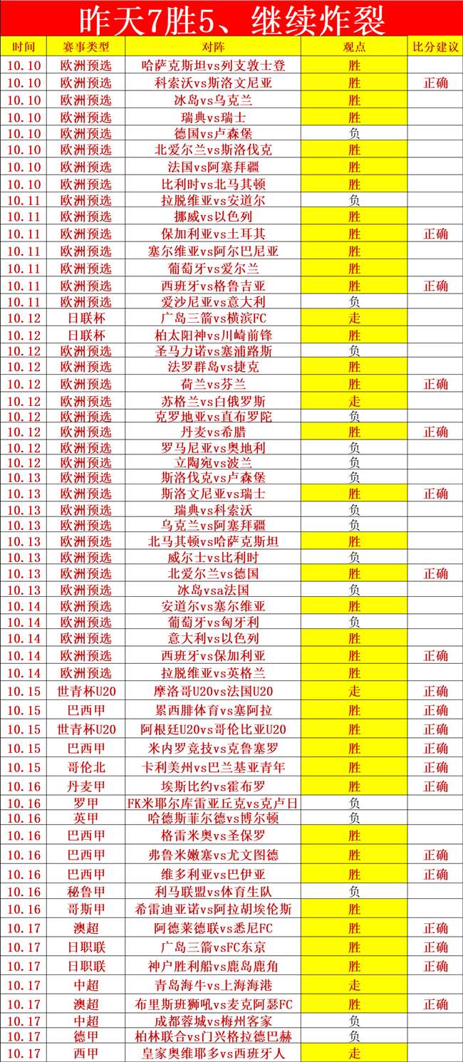 三、欧洲预选佳绩:连续6天的欧洲预选结束了,笔者创造了惊人的战绩,欧洲预选6天合计观点拿下39胜25的佳绩,命中11场比分。