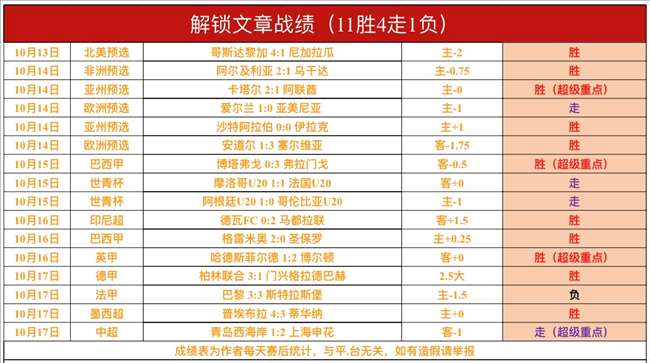 战绩回顾:昨日解锁文章4战拿到2胜1走1负,近16战拿到11胜4走1负,状态非常强势!【超级重点】依然保持3连胜!赞赏数据1场,中超青岛海牛胜利,赞赏数据近20胜15,成绩很出色!总进球数1场,阿塞超托武兹小方向没有打出,总进球数近10胜7!鸡锅不追求场次多,追求少而精准,绝不滥竽充数,必须把老铁们的每一份信任都转化为胜利!