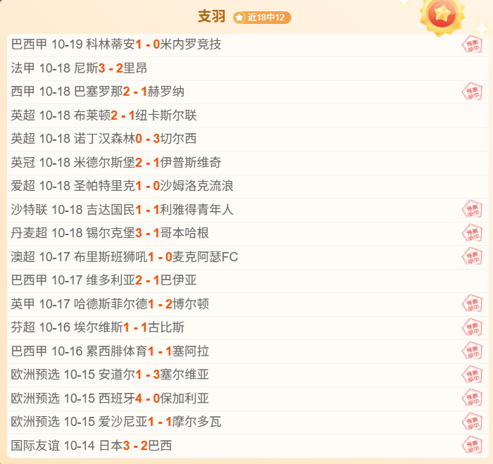 昨天的成绩中规中矩,5中2,只有科林蒂安1-0米内罗竞技拿下比分;今天我会继续努力,做好每一场比赛的分析。