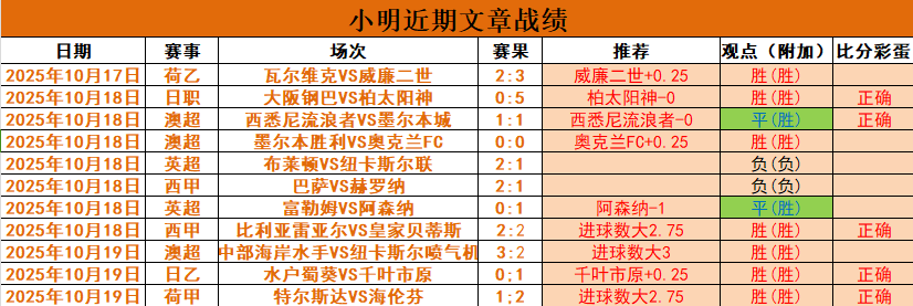 【上期回顾】早场全胜,晚场再战!昨文章7中5,奥克兰、柏、贝蒂斯大格局成功打出,阿森纳、西悉尼打平,近11中9。昨拿下柏+横滨水手3600%日职组合,周末2天5场早场全对,状态超神!晚场争取完美收官。