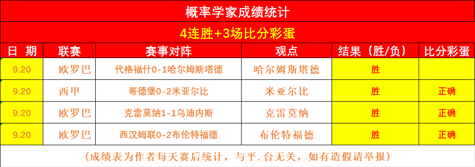 战绩回顾:4连胜+3场比分彩蛋,状态用神勇;前段时间由于国际比赛日,笔者也出现了一点起伏,很快马上就调整过来了。大家可以点点关注,建议不要单单挑选某一场比赛,某一篇文章,要留意概率送出的每一场比赛,这样就可以更好地与概率同步,可以长期取得正向的收获。