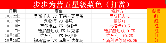 近5中3,昨天利物浦没想到会反弹,今天继续带领大家收获成功;五星级菜单方面,罗斯托夫昨晚在俄杯取得大胜,4-1击败下诺夫哥罗德,五星级菜单6连胜。想要获得五星级菜单的朋友可以在打赏文章下方点击打赏88球币即可获得推送。