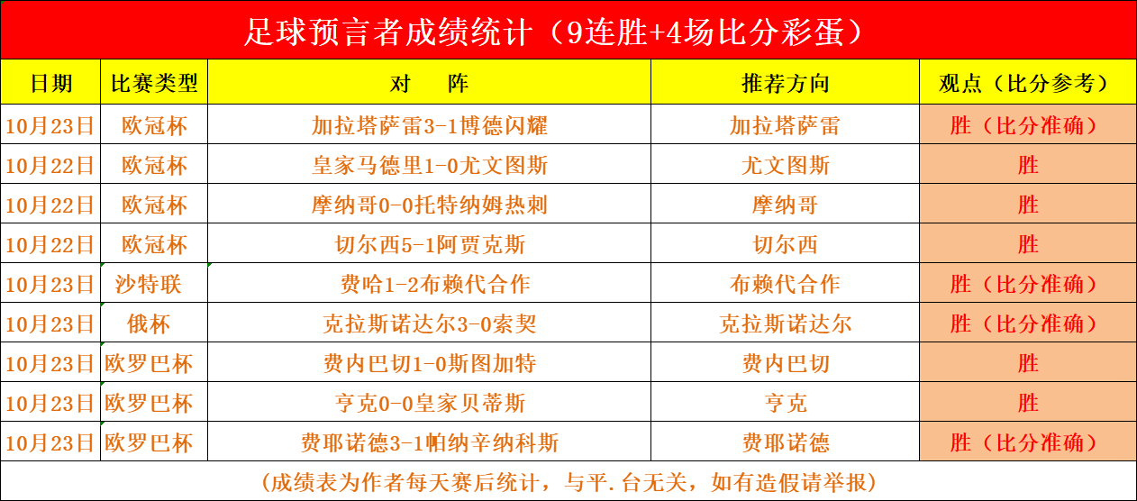 成绩回顾:9连胜+4场比分彩蛋,状态相当火热;今天我们将再次扬帆起航,继续乘胜追击,追求长期稳定的表现是笔者不变的目标,足球预言者将不断为大家精心挑选值得信赖的赛事,为大家提供参考。