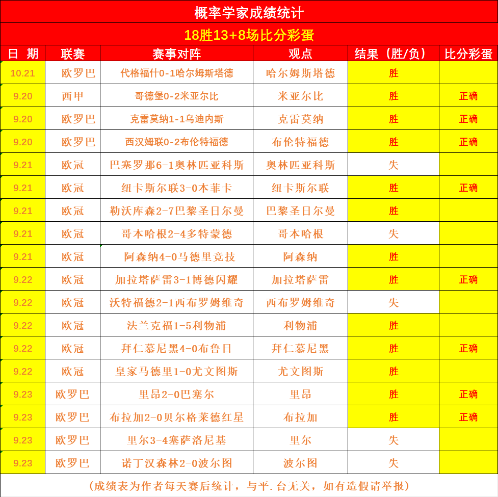 战绩回顾:18胜13+8场比分彩蛋,连续多天取得正向成绩,状态相当理想。大家可以点点关注,建议不要单单挑选某一场比赛,某一篇文章,要留意概率送出的每一场比赛,这样就可以更好地与概率同步,可以长期取得正向的收获。