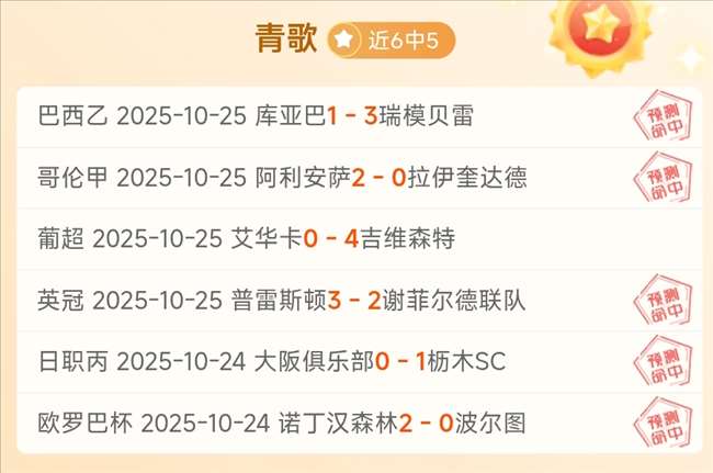 青歌简报:在刚结束的强项赛事巴西乙再次拿下后近期整体走势平稳来到了6中5,今日拿手赛事非常多,感谢各位的大力支持,继续努力,保持高光时刻!