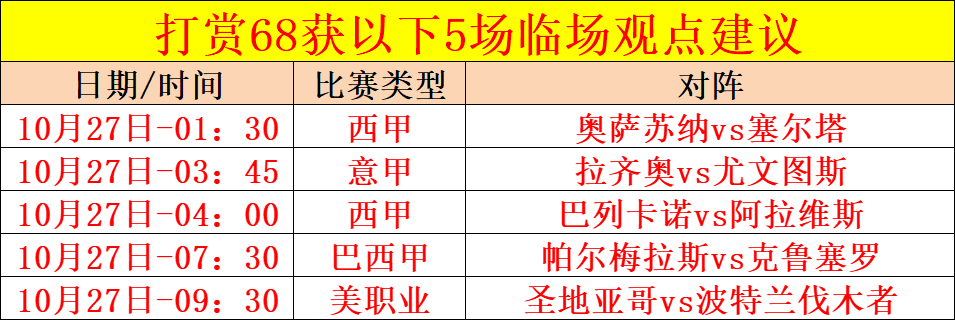 注:今日打赏68可获以下5场欧罗巴临场观点建议