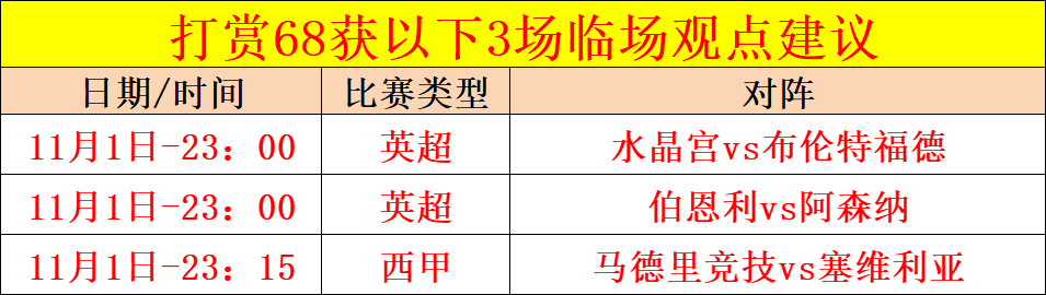 注:今日打赏68可获以下3场欧罗巴临场观点建议