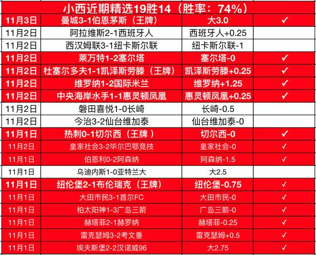 战绩回顾:近19胜14!兄弟们!胜.率是超过了7成之多,实力可见!晚场的王牌英超是一鱼两吃!比分拿下!今日王牌英超继续奉上!
