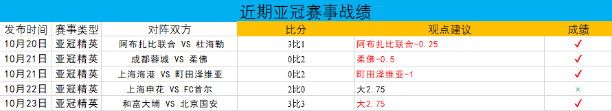 亚冠精英作为不知的信心联赛之一,近期也是获5场胜4场80%命中率的战绩,以下是不知统计的战绩表格供大家观看,今日带给大家亚冠的信心分析!在此也祝大家越来越红!