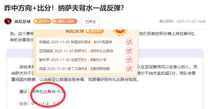 昨日希腊超和亚冠全部拿下,近4全胜,亚冠顺带还命中了比分,肯尼状态十分火热,大家快来看看我发布的越南联比赛分析文章吧!