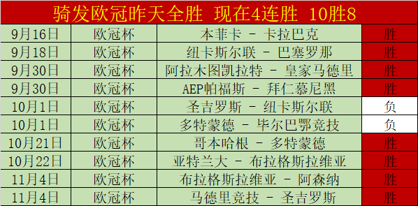 欧冠昨天两场全胜,现在4连胜,近10胜8,欧冠继续值得期待。昨4场全胜,19天胜11天胜+12,狂飙胜+值得认可!