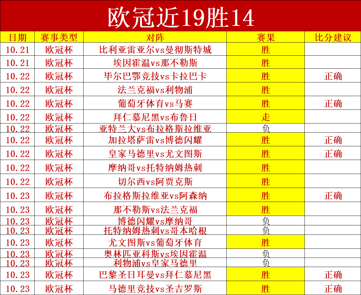 一、战绩回顾:昨天表现不俗,公推+解锁拿下7胜5的佳绩,公推2场全胜,并且命中2场比分,欧冠杯继续出色,欧冠杯过去27场在70%的胜.率,今天强项欧冠继续。
