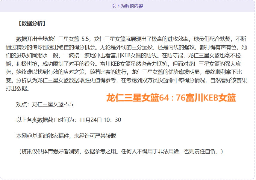 【成绩回顾】昨2胜,昨3战2胜战绩,精选比赛拆解本期再创连胜新高度,篮球方向连胜呈现非同凡响,拆解精准比赛继续收获连胜,篮球板块拆解数据勇往直前,资深篮球爱好者,用独立方式拆解赛事再为大家奉上。以下再为大家分享一场精彩赛事,敬请期待!