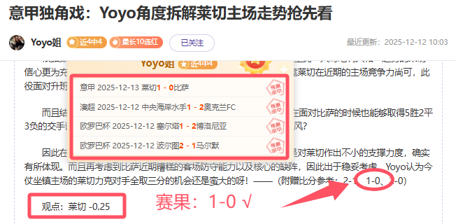 【上期回顾】:昨天私推暂停,而公推澳超多进球再次成功拿下,近12胜10表现不错!另外超级重点意甲方案莱切同样直接彩蛋击出棒棒哒!——今天核心赛事已确认,信心依旧,各位可点击一下【赞赏】按钮给予鼓励,轻松在“站内信”获取当天新鲜信心专场哦!多一份参考离喜悦再近一步,Yoyo将继续率粉粉们继续前行~