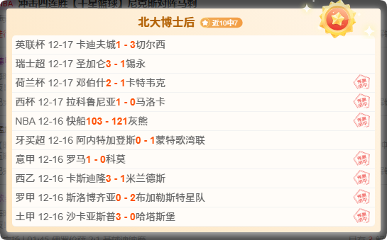 ★ 北大博士后:近10胜7实力出众!20年足篮赛事深耕,全天追踪精研每场,皇牌场次稳定输出,观赛首选分析师!