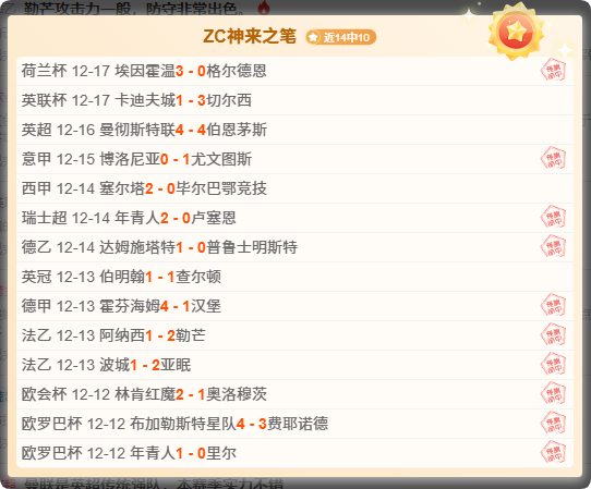 ★ ZC神来之笔:近14胜10战绩超群!20年行业经验,基本面结合数据变化精准研判,多联赛全覆盖,带您轻松拿捏赛事走向!