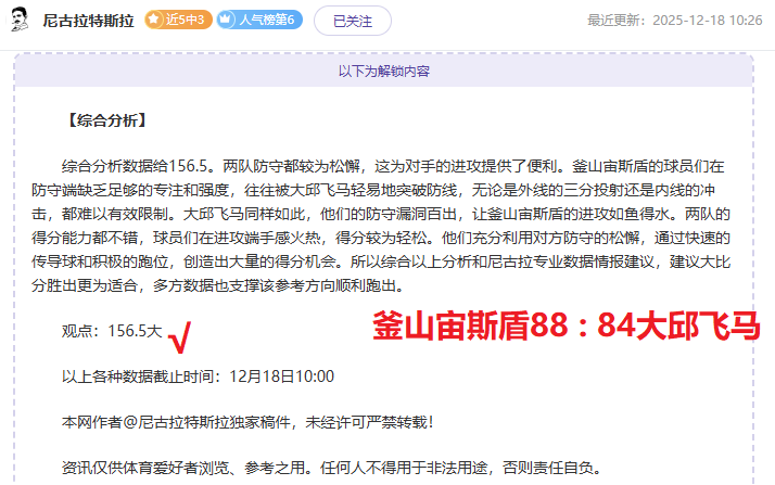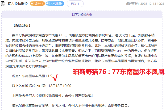 【成绩回顾】昨拿下4战胜利,NBA+NBL+韩篮甲+CBA拿下胜利,信心赛事多项拿下连胜!尼古拉资深作者情报解读再有方法,信心强项情报解读连胜赛事再次出发,长期解读惊喜不断,此前作者创下4次双位数胜战绩,掌握着一手赛事资深情报,本期继续分享充满奇妙体育赛事,敬请大家持续关注!!