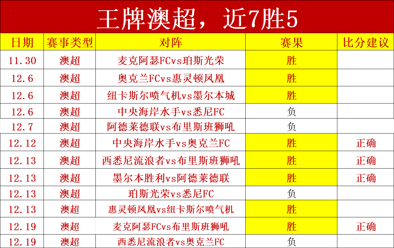 昨天王牌澳超1胜1负,麦克阿瑟顺利打出,也算是个小冷门,布里斯班不败太便宜,澳超目前7胜5,保持较高的胜.率,今天王牌澳超继续。