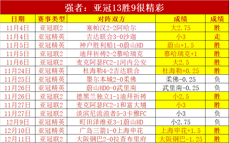 亚冠13胜9,亚系赛事一直十分出色的。刚结束的周末实在精彩,近17胜12,精彩发挥启动新一周信心。11月胜+16,10月胜+16,过去两个月合计胜+32,月成绩非常精彩