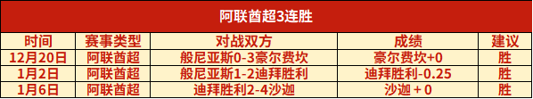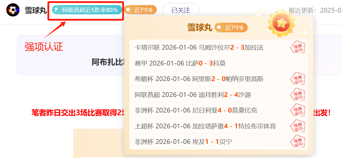 昨天4胜3,近7胜6,1月连续5天保持胜利,26场17胜,6天净胜+8,12月净胜+15。阿联酋超3连胜,持续关注的粉丝有福了,长期稳定的胜利表现,当然值得信赖!别错过了,2026年更加美好,看好的朋友别犹豫!今天赛事依旧选择强项系列,笔者近期前进脚步表现仍然优秀,本日赛程继续出击,争取在稳健的基础上进一步突破!