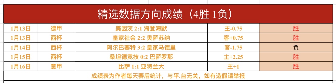 战绩回顾:昨日【超级重点数据方向】1场法甲大巴黎完美高位全胜,数据超级重点近7胜5!【超级重点总进球数】1场芬联杯玛丽港大方向没有打出,超级重点总进球数近6胜4!《精选数据方向》1场意甲比萨方向完美高位全胜,精选数据方向近5胜4!私推总进球数依然近4胜3!鸡锅不追求场次多,追求少而精准,绝不滥竽充数,必须把老铁们的每一份信任都转化为胜利!