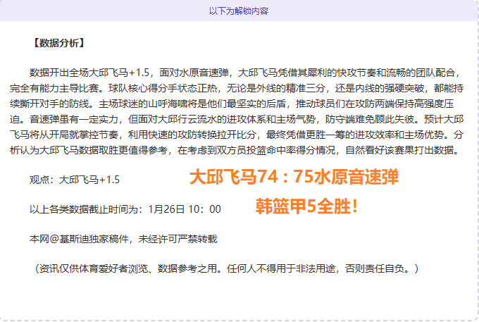 【成绩回顾】昨3胜,韩篮甲、NBL、中台大女联胜。韩篮甲近五全胜!NBL赛事近七全胜!精选比赛拆解本期再创连胜新高度,篮球方向连胜呈现非同凡响,拆解精准比赛继续收获连胜,篮球板块拆解数据勇往直前,资深篮球爱好者,用独立方式拆解赛事再为大家奉上。以下再为大家分享一场精彩赛事,敬请期待!