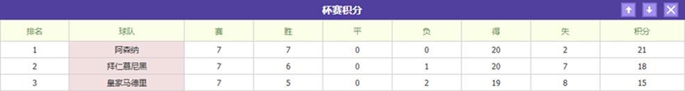 在当前的积分榜上,阿森纳7战全胜积21分高居榜首,拜仁18分紧随其后。末轮阿森纳只需保持不败,即可确保头名位置。