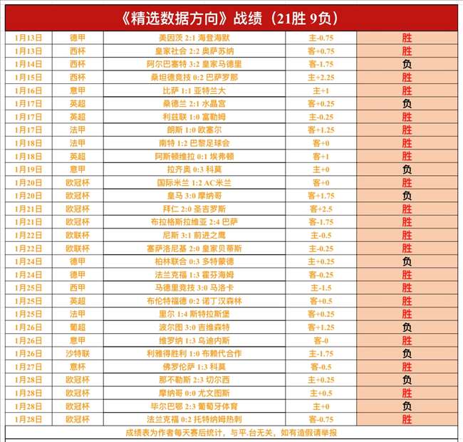 战绩回顾:昨日【超级重点数据方向】1场欧冠杯利物浦轻松大胜,近19胜13!《精选数据方向》4战拿到2胜2负,欧冠杯热刺、摩纳哥胜利,那不勒斯、毕尔巴鄂没有打出,近30胜21!私推{数据包周}1场小负一半,近期成绩不佳!私推总进球数依然近4胜3!【超级重点总进球数】没有发送!鸡锅不追求场次多,追求少而精准,绝不滥竽充数,必须把老铁们的每一份信任都转化为胜利!