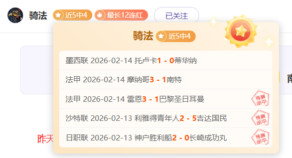 最近更新:2026-02-14 13:55 近12中8最长12连红